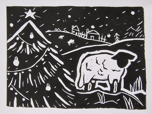 A sheep on a Christmassy landscape. A6. Lino print on paper on card. 2025.