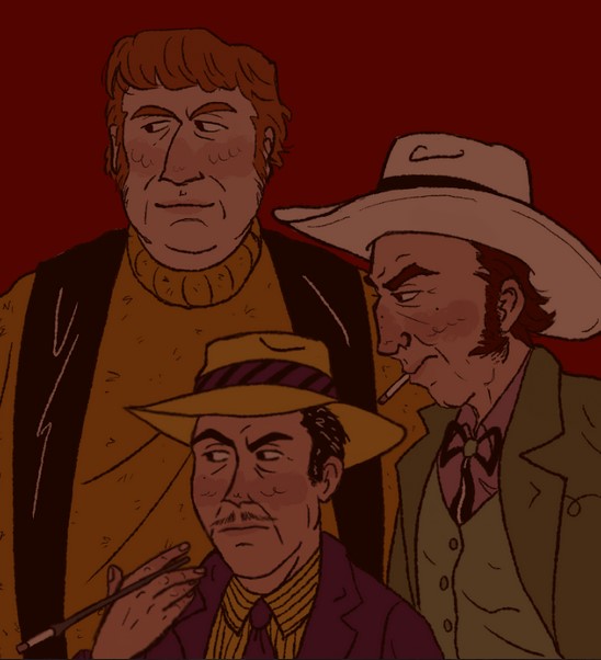 Redraw of a panel of the Enforcers (Ox, Fancy Dan, and Montana) from a Spider-Man Noir comic (I think), with their designs mostly taken from the Spectacular Spider-Man cartoon and comics. Digital. 2021.
